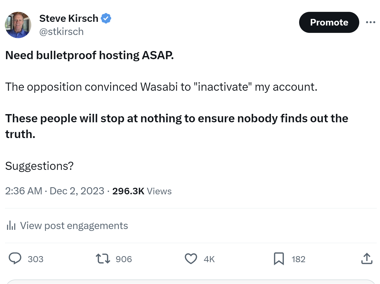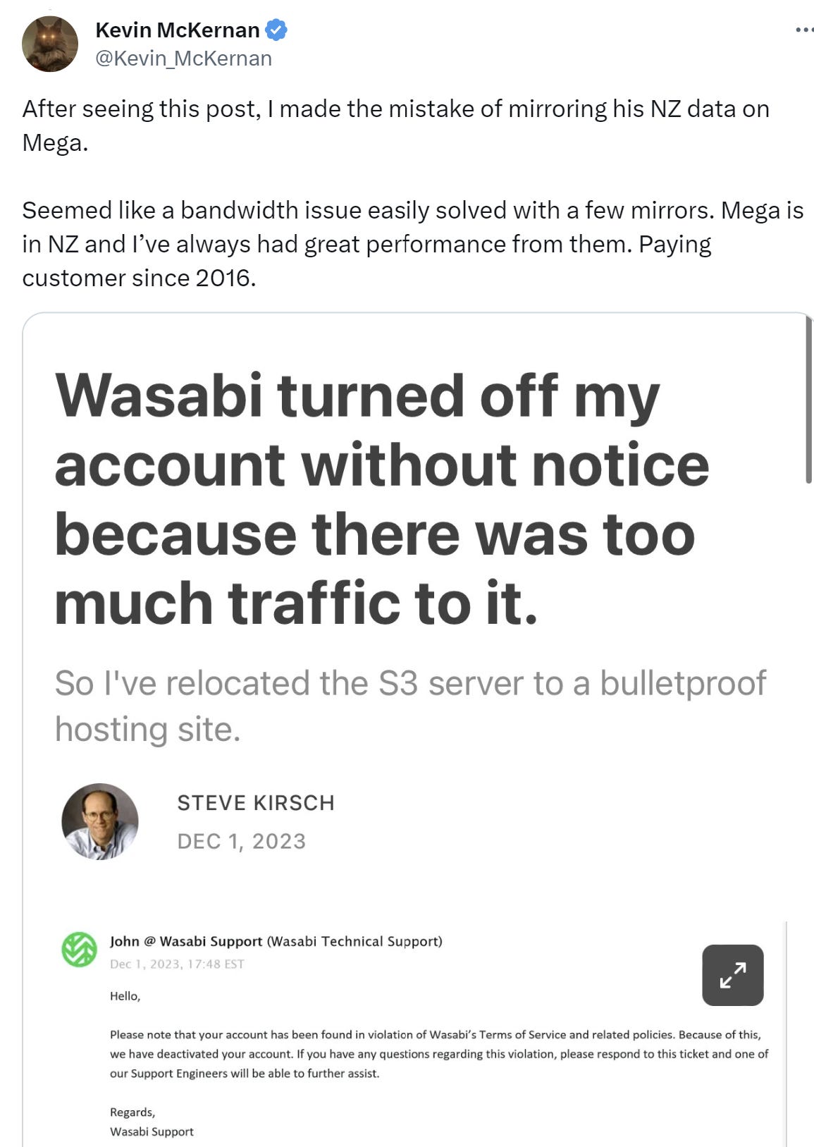 Kevin McKernan saw my post about Wasabi asking for a “bulletproof” hosting provider.