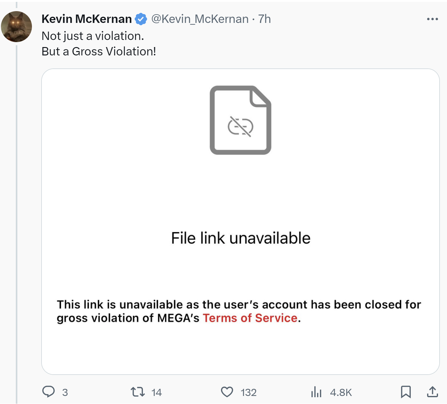 MEGA judges Kevin to have made a GROSS violation. They never spoke to him. You are guilty if they think you are and MEGA does NOT want to hear your side of the story. NUKE first, no need to ask any questions.