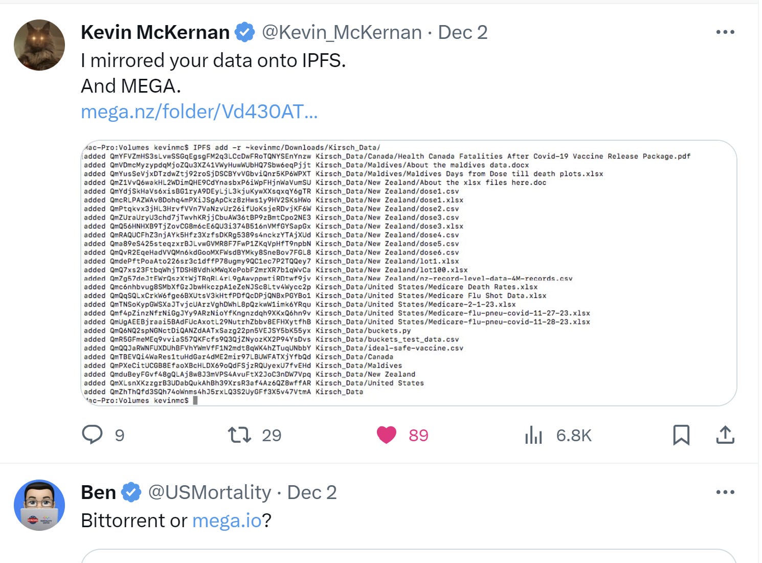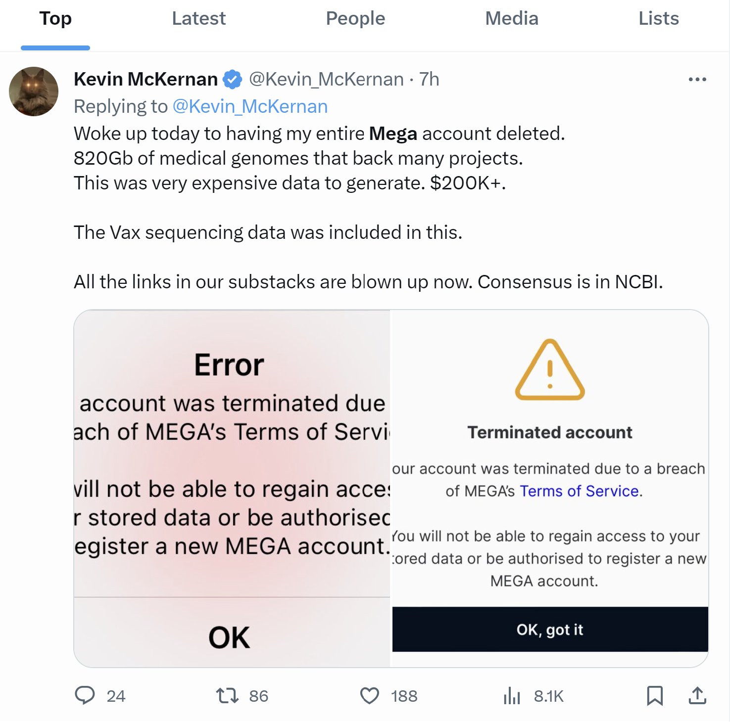 Kevin McKernan mirrored my data and MEGA deleted everything in his account. Everything. All the links to his research in his Substack are now BROKEN. All his data was permanently deleted and they wouldn’t give him a copy.