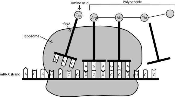 Just as with computer bits, ribosomes read genetic sequences. Based on their content, ribosomes create sequences of amino acids, which chain together and form proteins.