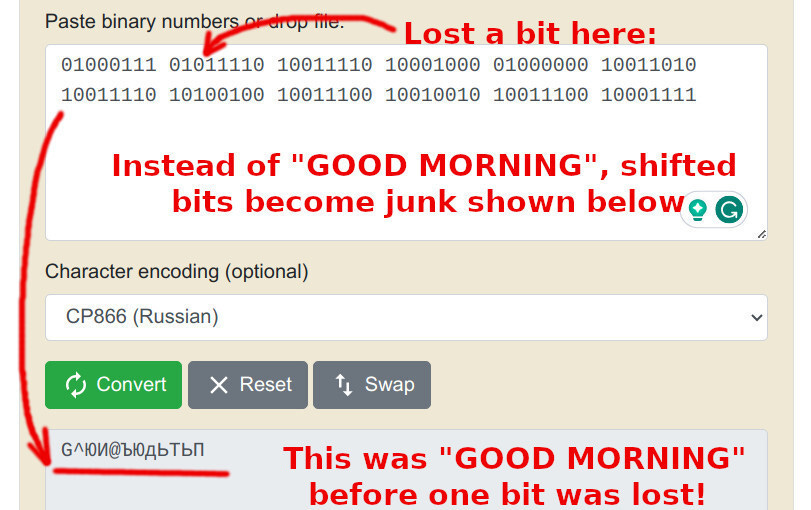 The bits would shift and would encode a garbage sentence “G^ЮИ@ЪЮдЬТЬП”: