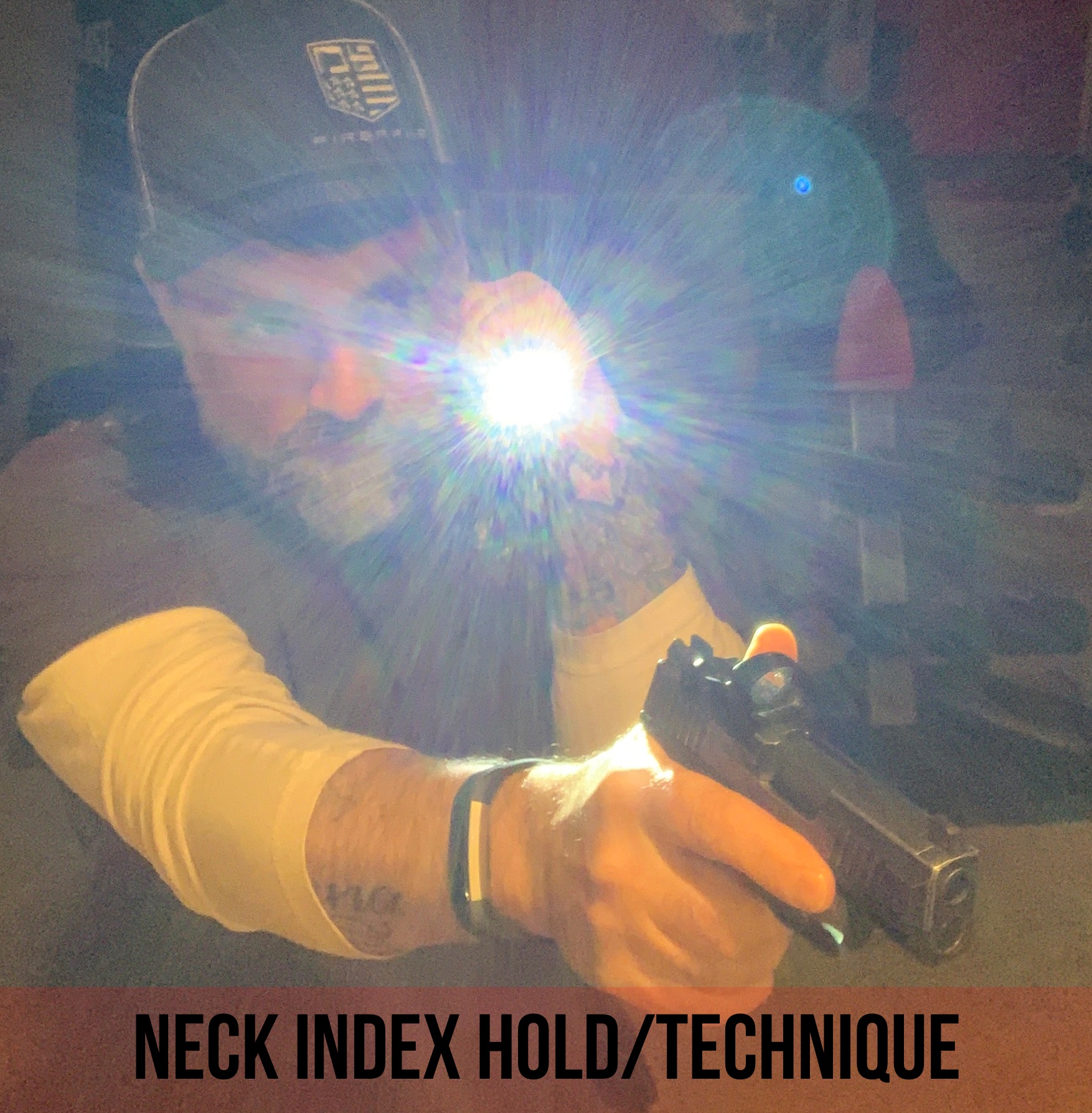 The neck index technique is used because it is an intuitive position to fight from. The light can move independently of the muzzle, making it great for searching.