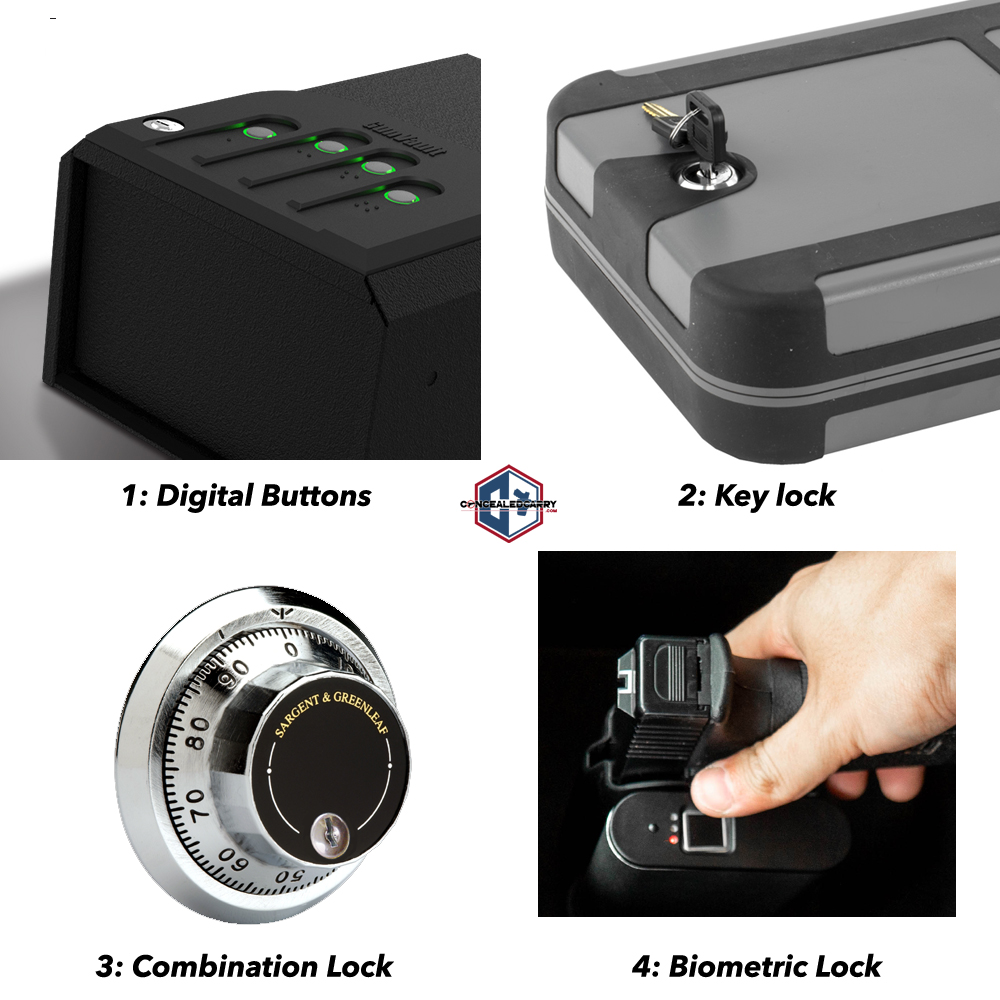 Avoid key locks and combination locks and of course make sure you can secure the safe itself to a substantial piece of furniture, wall studs, or something similar to prevent the safe itself from being stolen.