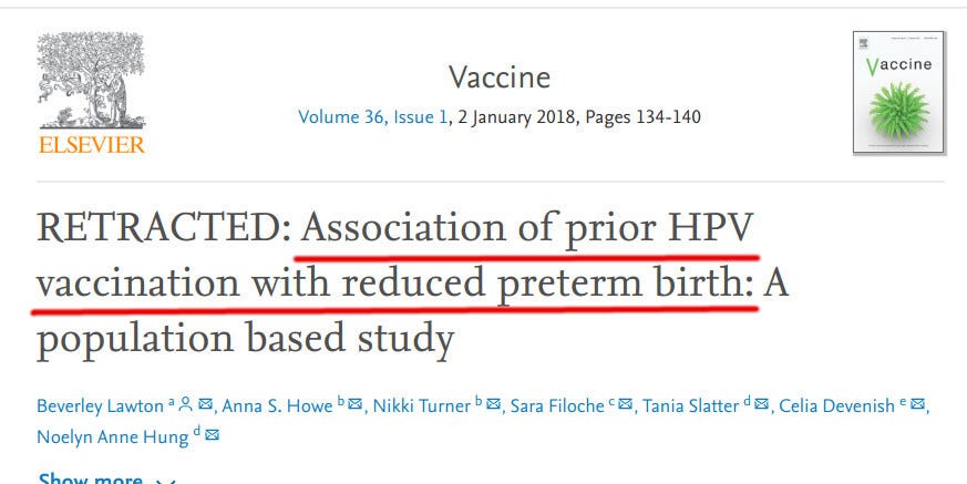 A study by New Zealand’s Beverley Lawton et al. “proved” that receipt of the HPV vaccine reduced preterm births. [As it turns out, it appears as if the exact opposite is true. mrossol]