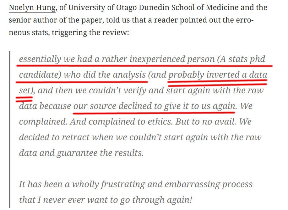 One of the co-authors blamed an unspecified “stats PhD candidate” for the error: