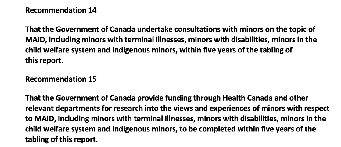 Another Canadian government report issued this year specifically addressed the assisted deaths (MAID) of minors, and has recommended the following: