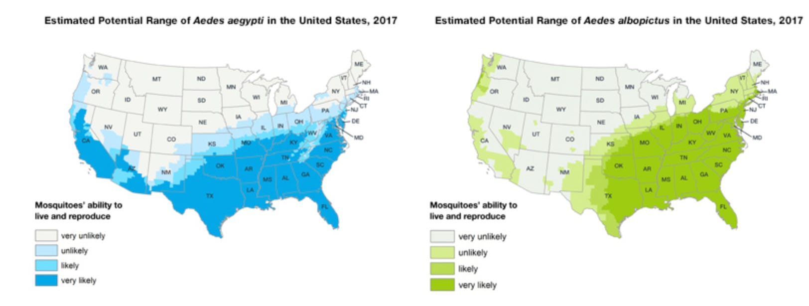The mosquitos that spread yellow fever are Aedes aegypti and to a lesser extent, Aedes albopictus, are both species are found in the USA. Beware of statements from the Dr. Peter Hotez, the CDC and other government entities warning that the spread of disease from these vectors is being due to “climate change”. As documented as far back as 1693 through the 1904 yellow fever outbreak, these mosquitos (Aedes aegypti) have been endemic in the USA for centuries – even in the Northeast. This is not a global warming or climate change issue. This 2017 map of the range of these mosquitos is from the CDC.