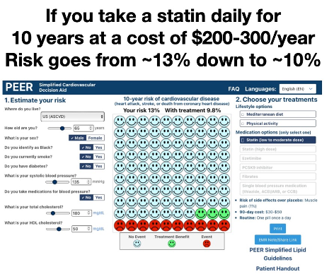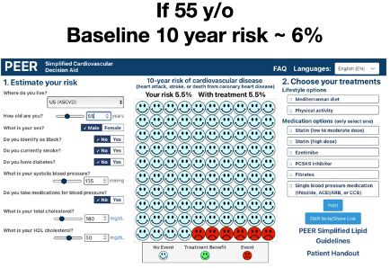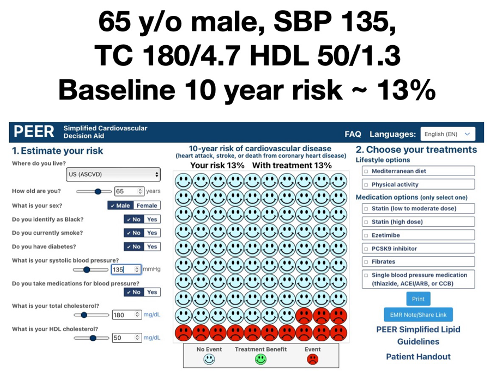 In Adam’s scenario, it’s likely the patient’s 13% risk came from a cardiovascular (CV) risk calculator tool. To facilitate this discussion, I used the ASCVD calculator to create a fictional patient who would have a 13% 10-year risk of a CV event (a fatal or non-fatal heart attack or stroke). The patient is a non-diabetic, 65 y/o male, SBP 135, total cholesterol 180 mg/dL (4.7mmoles/L) and HDL 50 (1.3). The risk tool I used is part of what our group developed in the just released revision of our national Simplified Lipid Guidelines for Primary Care. The Simplified Cardiovascular Decision Aid can be found here.