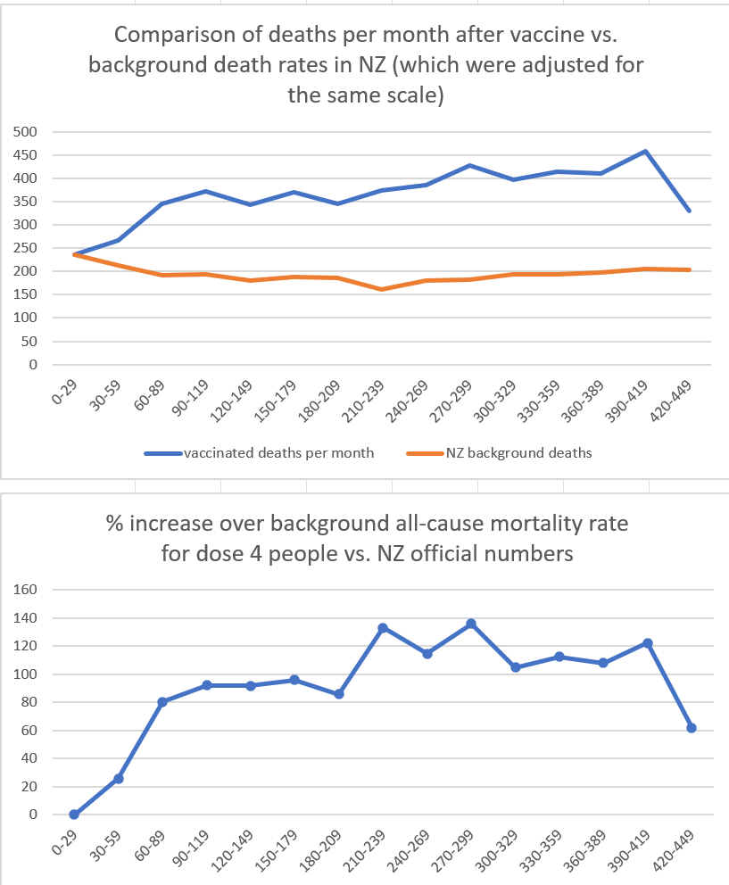 You can also look at Dose 4 alone. I picked everyone who got the shot in July 2022 so I could track this vs. the background deaths in NZ. The death rate goes up if you got the shot while the rest of New Zealand’s death rate is falling.