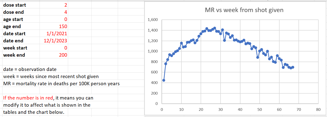 Mortality rate in deaths per 100K person years vs. week number since vaccine administered (x-axis). This is for doses 2 through 4. It’s “supposed” to slope down due to seasonality. The slope goes the wrong way if the vax is safe. Nobody can explain this. This is not due to the “healthy vaccinee effect” (HVE) which lasts only 4 weeks.