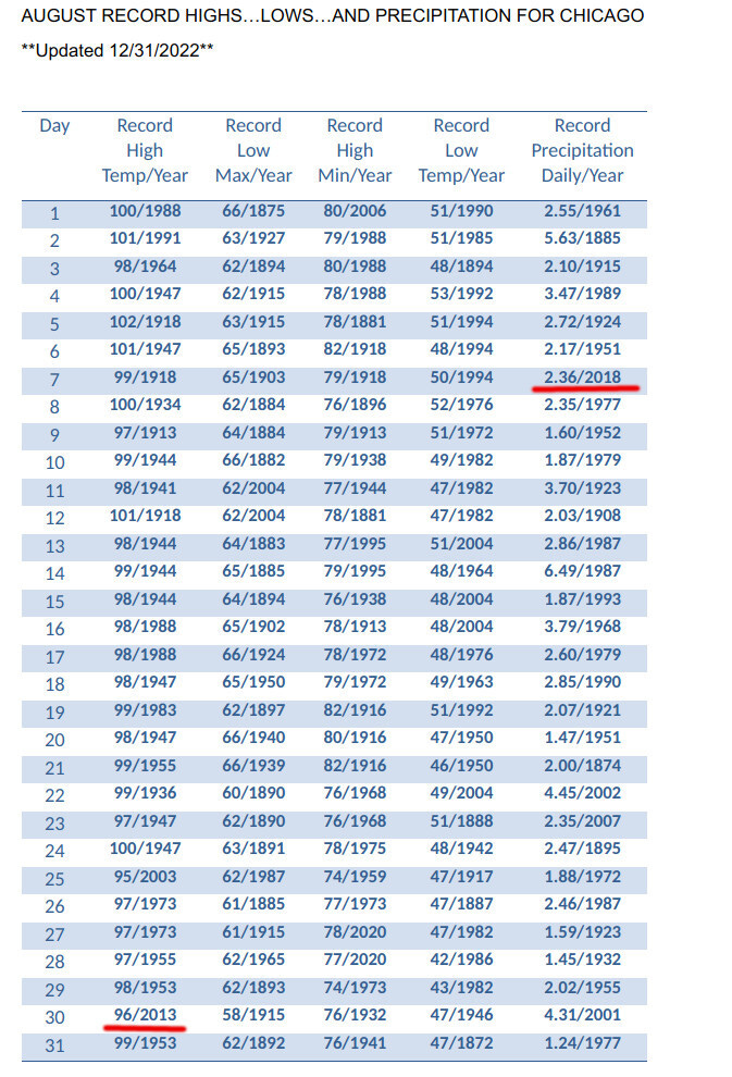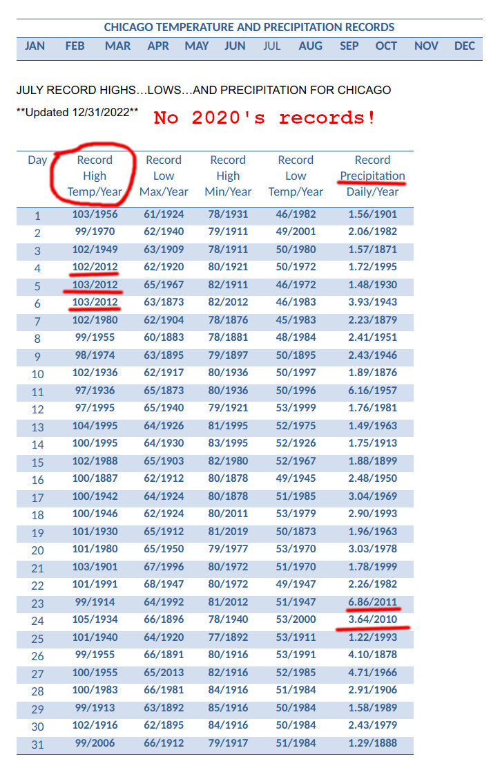 Look at the “Daily weather records” for Chicago, presented by Weather.gov. It shows weather records by year for every day of any given month. The records include temperature highs and highest precipitation. For July, usually the hottest month, I highlighted any weather records achieved since the year 2010, for highest temperature and precipitation: