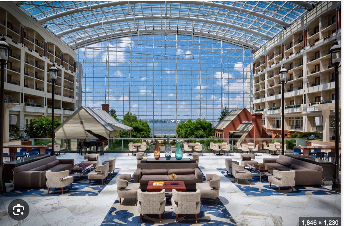 When we reached the Gaylord Hotel in National Harbor, Maryland, a fairly recently-developed part of the shore alongside the Potomac opposite Alexandria — I felt a bit disoriented. National Harbor looked like Disneyland — “walkable” “city” streets, but lined with slick restaurants and themed bars aimed at conventioneers and tourists, but with none of the grit or eccentricity of a real city. A massive, blue-illuminated Ferris wheel spun slowly at the egs of the dark, slow-moving water.
