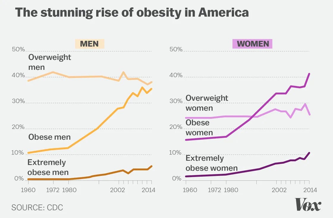 Things greatly changed around 1970, when rates of obesity tripled for men and women.