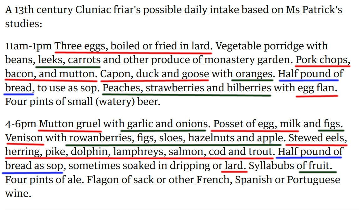 The new evidence backs records from Westminster Abbey, showing that six eggs a day was normal for monks. In the middle ages, monkish obesity was Europe-wide. The Portuguese Cistercians had a test: monks unable to squeeze through a certain doorway at Alcobaca monastery’s dining room had to fast while slimmer colleagues tucked into “pastry in vast abundance.”