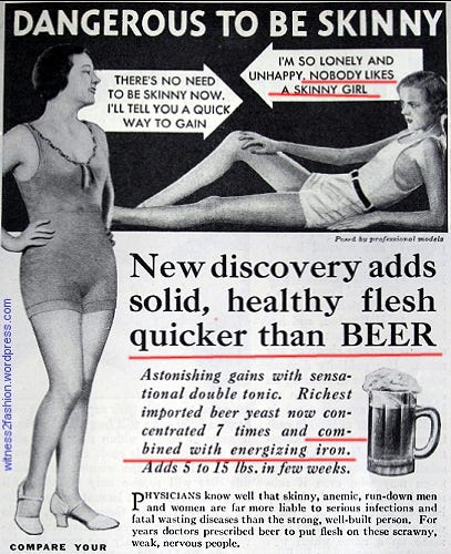 During the early 20th century, women had body image problems and anxiety due to being too thin. A cottage industry of weight gain products existed for such women: