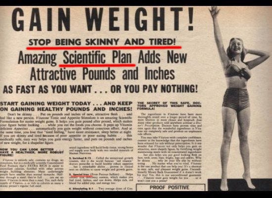 (an aside: those weight gain products possibly benefited from iron mentioned in both ads. Excess iron is known to impair glucose tolerance, resulting in a tendency to gain weight. Almost all weight gain ads from that time mention iron. If you do not believe me, view the ads and check for yourself.)