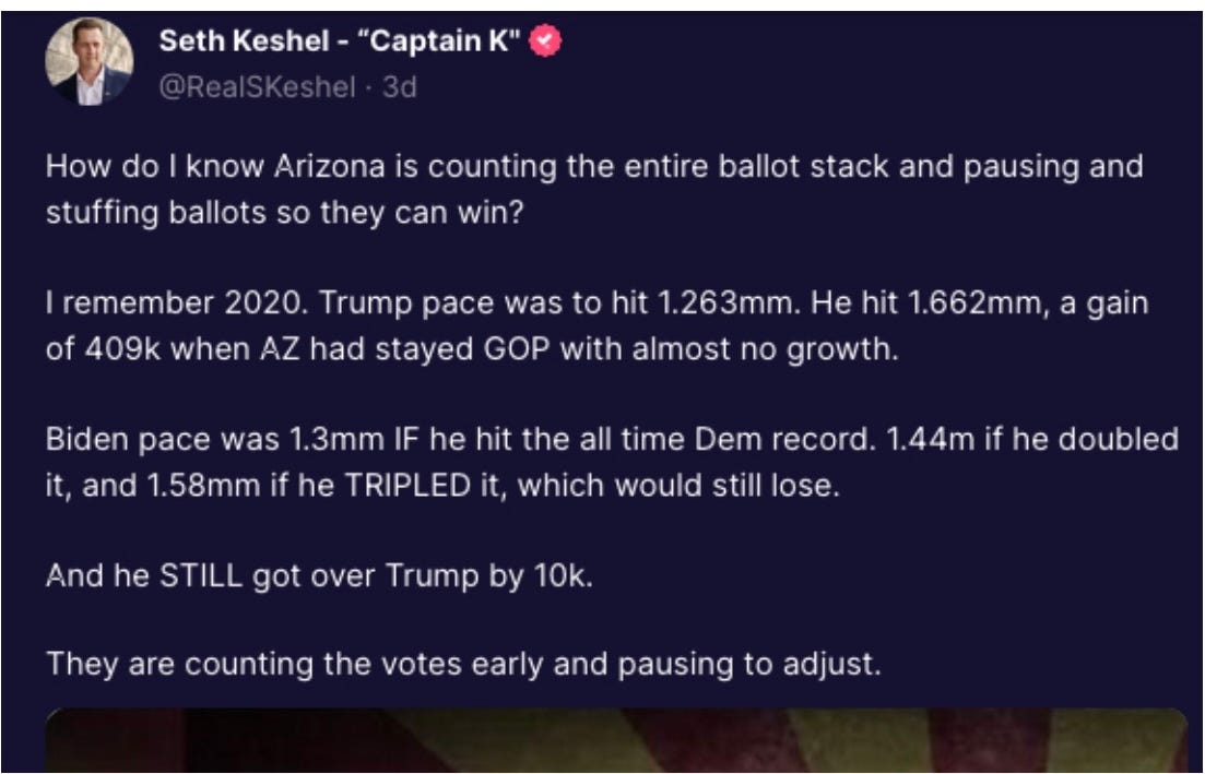 3. Weaponized incompetence. Prior to the election, logic and accuracy tests are performed on all machines and processes. In Arizona, on the day of voting, when and where most R’s vote, scanners didn’t scan and printers had configuration issues and ink settings were improperly set so that ballots were unreadable. In Arizona, there were printer/tabulator failures in 62.61% of the vote centers on election day, resulting in long lines at a majority of all vote centers, which led to de facto substantial voter suppression. People were told (illegally) to check out and check back in at another polling location, which is a violation because of ‘double voting’. and which would ensure their vote wasn’t counted. The voting machines that recorded R ballots were broken, the paper settings would not accept ballots that were one inch longer than required by the machine. When machines do not accept ballots, voters are asked to provide provisional ballots that were sequestered and “cured” (validated) later. This is a vector for fraud. It is ‘spoiliation’, an important term to remember. Tens of thousands of ballots were treated that way in Maricopa which is why the election count took so long. Provisional ballots had to be “cured”.