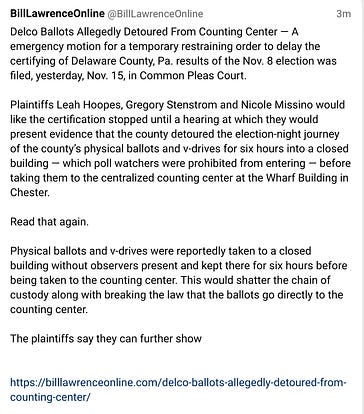 Well, the hearing was basically held but limited to specific allegations made in the plaintiffs filing, namely that 2,778 records of requests for mail-in ballots were deleted by the county; at least 194 voter registration records of individuals who voted were deleted; a partisan third-party was allowed to control and tabulate mail-in ballots; and the chain of custody was adulterated by detouring the election-night journey of the county’s physical ballots and v-drives for six hours into a closed building, where poll watchers were prohibited from entering, before continuing the delivery to the centralized counting center at the Wharf Building in Chester.