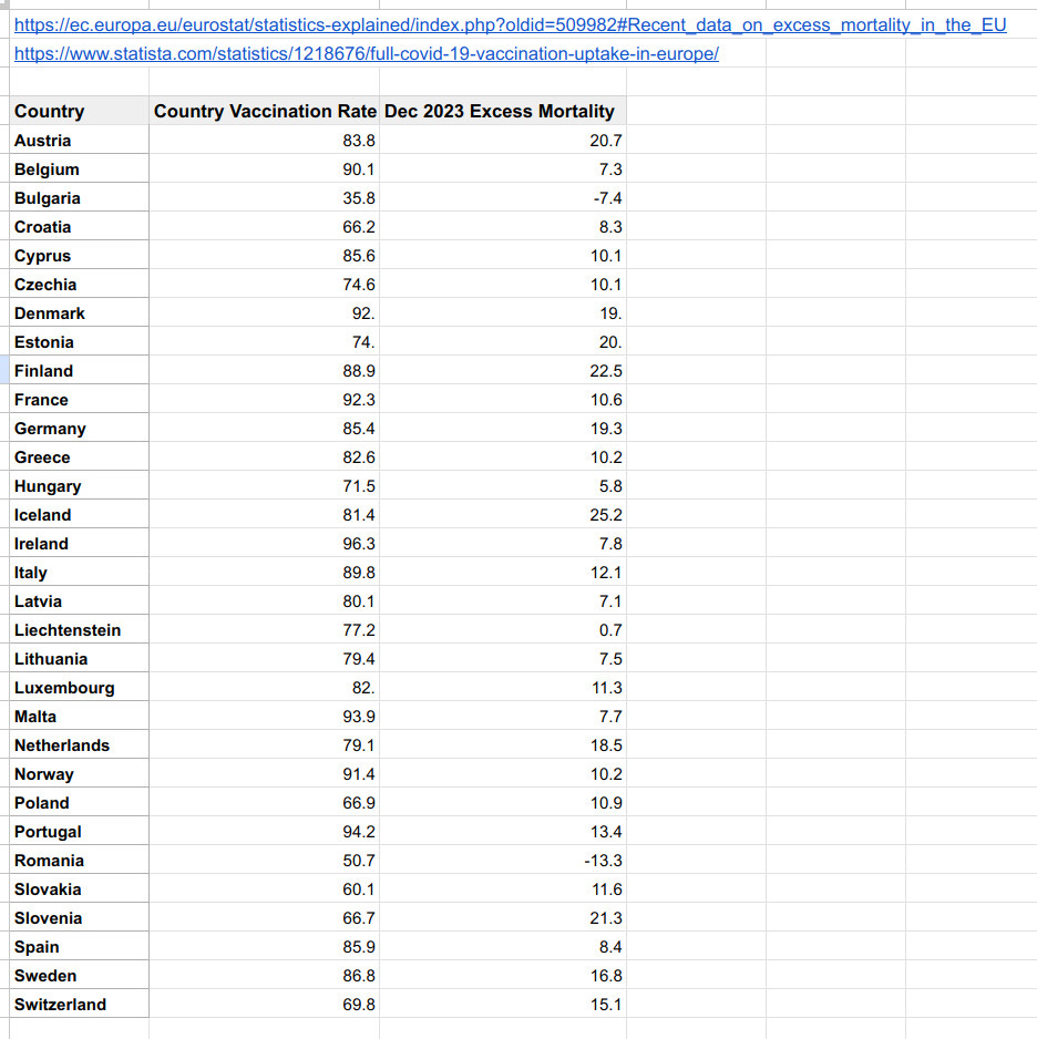 Sadly, data from last December shows a strong positive correlation between excess mortality and Covid vaccination rates, despite most first doses given out long ago, 2.5 years before that month.