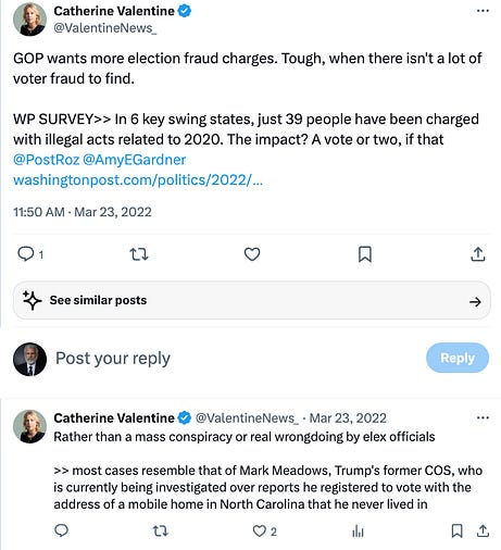 Of related interest is that seven months ago Catherine Valentine joinedSubstack as “head of politics”. Recently, she served as senior publicist on politics, justice and national security at The Washington Post. She identifies her mission at Substack as “making 2024 the Substack Election”.