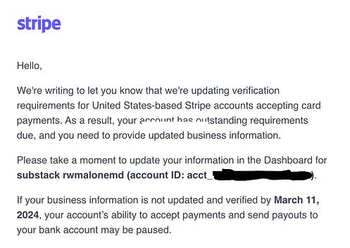 And now this. Stripe is requiring access to all financial transaction records from selected (targeted) authors’ bank accounts which receive subscription revenue from their Substack work product. The following is the key clause included in Stripe’s demand statement. While the initial message indicates that this is a request, subsequent communication from both Stripe and Substack has demanded that I comply within seven days or Stripe will cease transferring funds into my account.