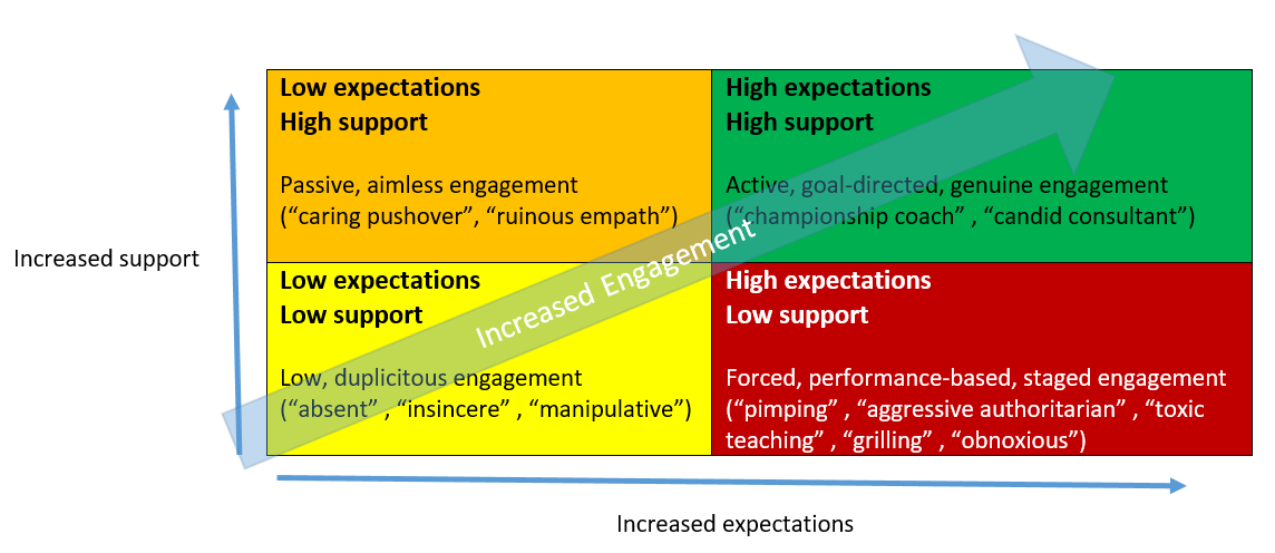 Longitudinal mentorship according to Daloz’s model (Figure below) allows high expectations and high caring to not be at odds. That said, the higher the expectations, the higher the mandate for support. Modular curricula may be able to allow for integration and assessment of new content, but it cannot teach moral judgement or character. It also cannot tailor precise learning experiences to maximize learner impact.