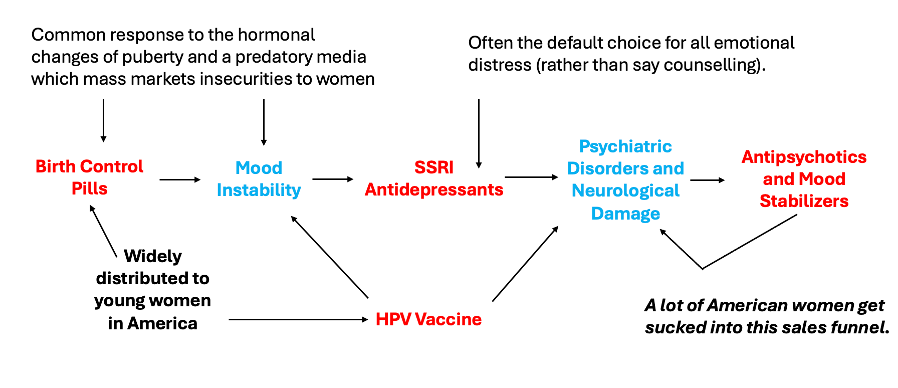 The first works by normalizing giving an “innocuous” drug to broad swathes of people and then selling increasingly expensive pharmaceutical drugs to treat the complications many experience from those drugs. One of the most insidious ones affects many of our girls and is one I’ve repeatedly tried to draw attention to: