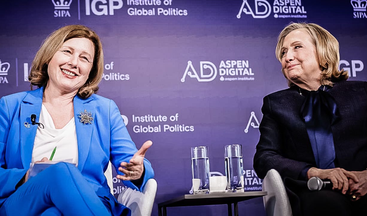 Vice President of the European Commission, Věra Jourová, (left) and Hillary Clinton (right), speak about “AI’s Impact on the 2024 Global Elections” at Columbia University’s School of International and Public Affairs on March 28, 2024 in New York City. (Photo by Shahar Azran/Getty Images)