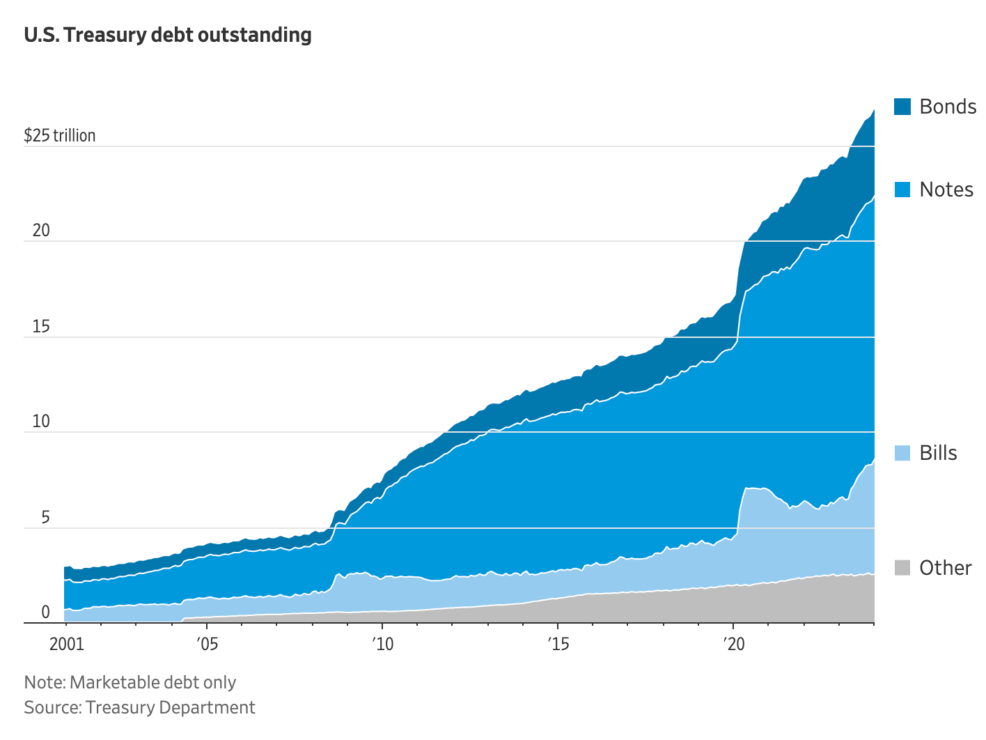 This has bloated the Treasury market to $27 trillion — up 60% since the pandemic. In other words, one third of Treasuries have fresh ink on them. And it’s up roughly sixfold since the 2008 crisis.