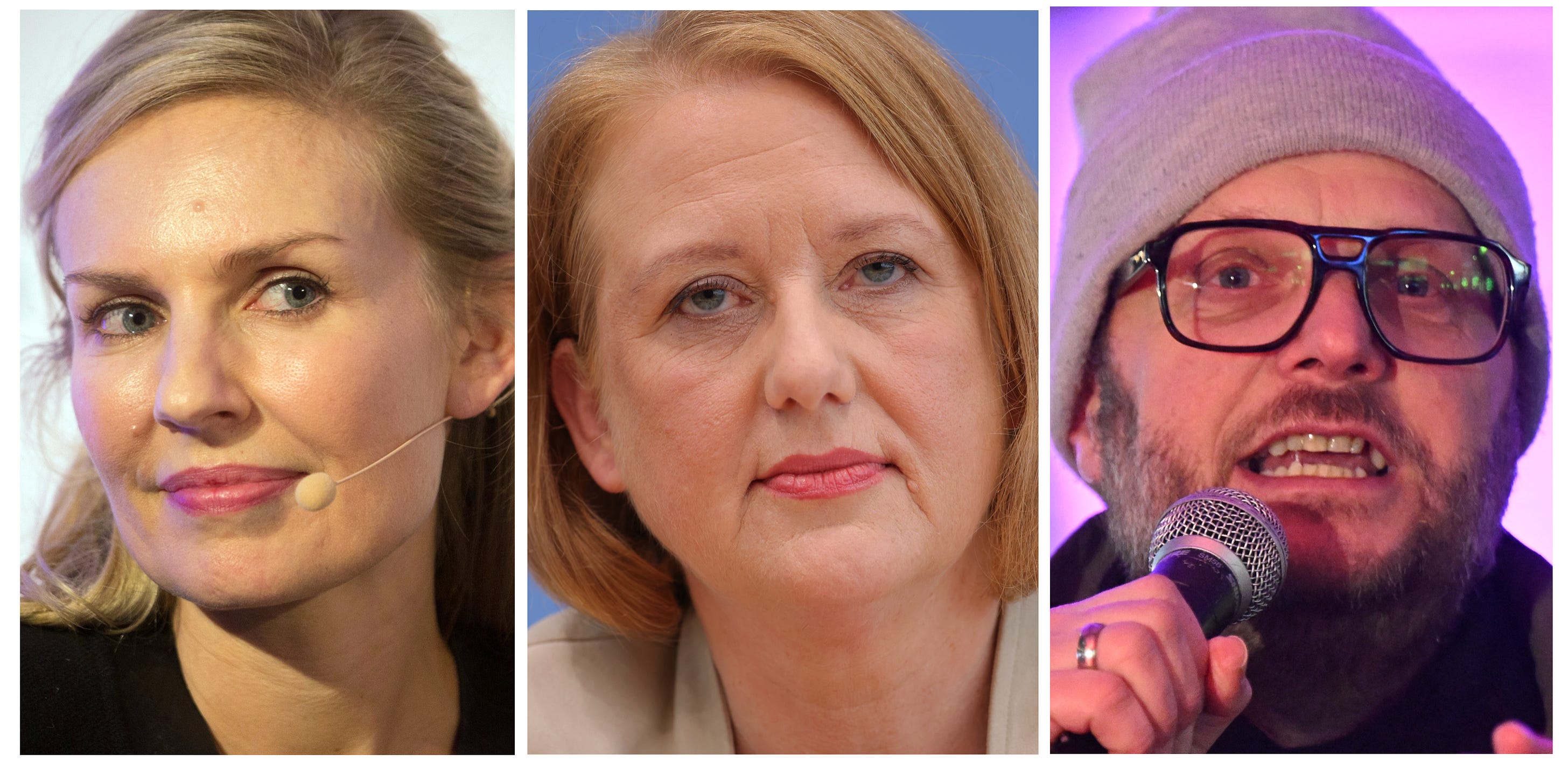 Sasha Havlicek, CEO, Institute for Strategic Dialogue (left); German Green Party politician and Minister for Family Affairs, Lisa Paus (center); and Correctiv” founder, David Schraven, at an anti-AfD rally (right)