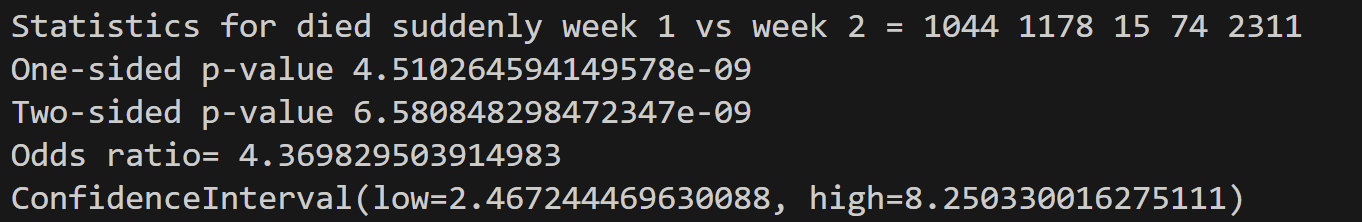 In plain English, your odds of “dying suddenly” were 4.3X higher in week 1 vs. week 2 and the number of cases were so large that the probability that this “anecdote” happened by random chance is 4.5e-9, which is nearly 1 chance in a billion.