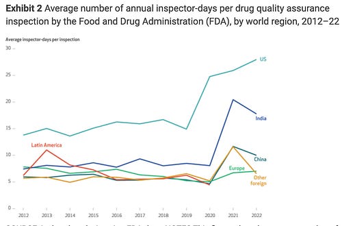 Exhibit 2 shows that FDA inspector days for the Chinese region were less than ten days per year.