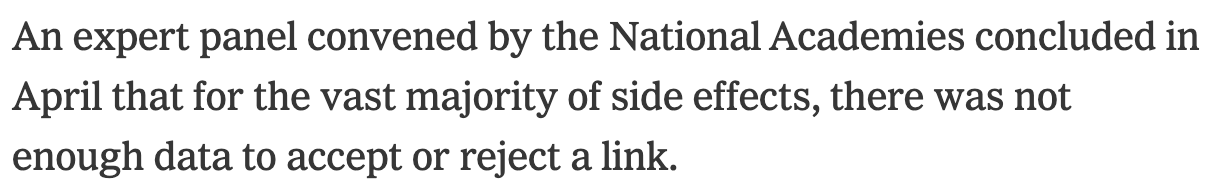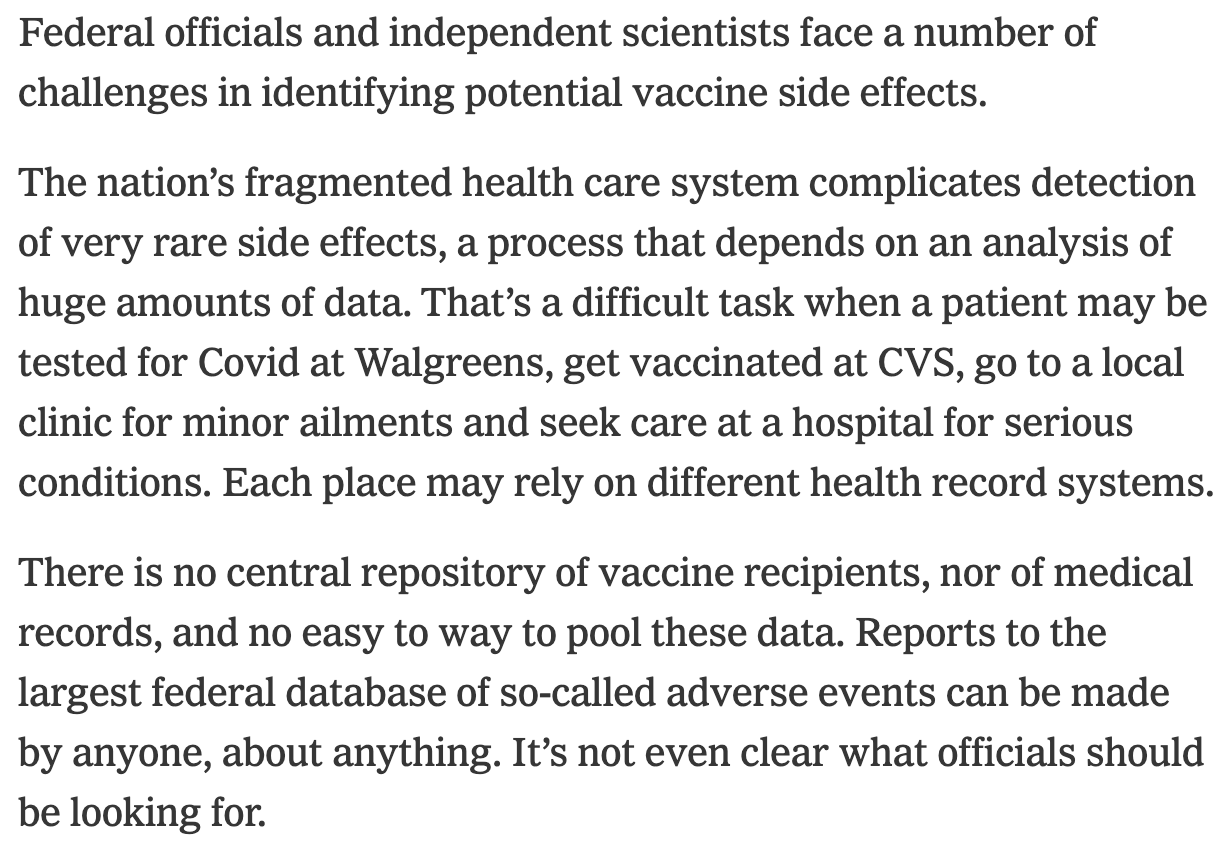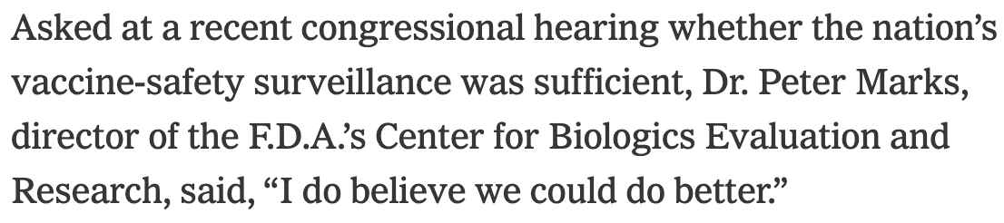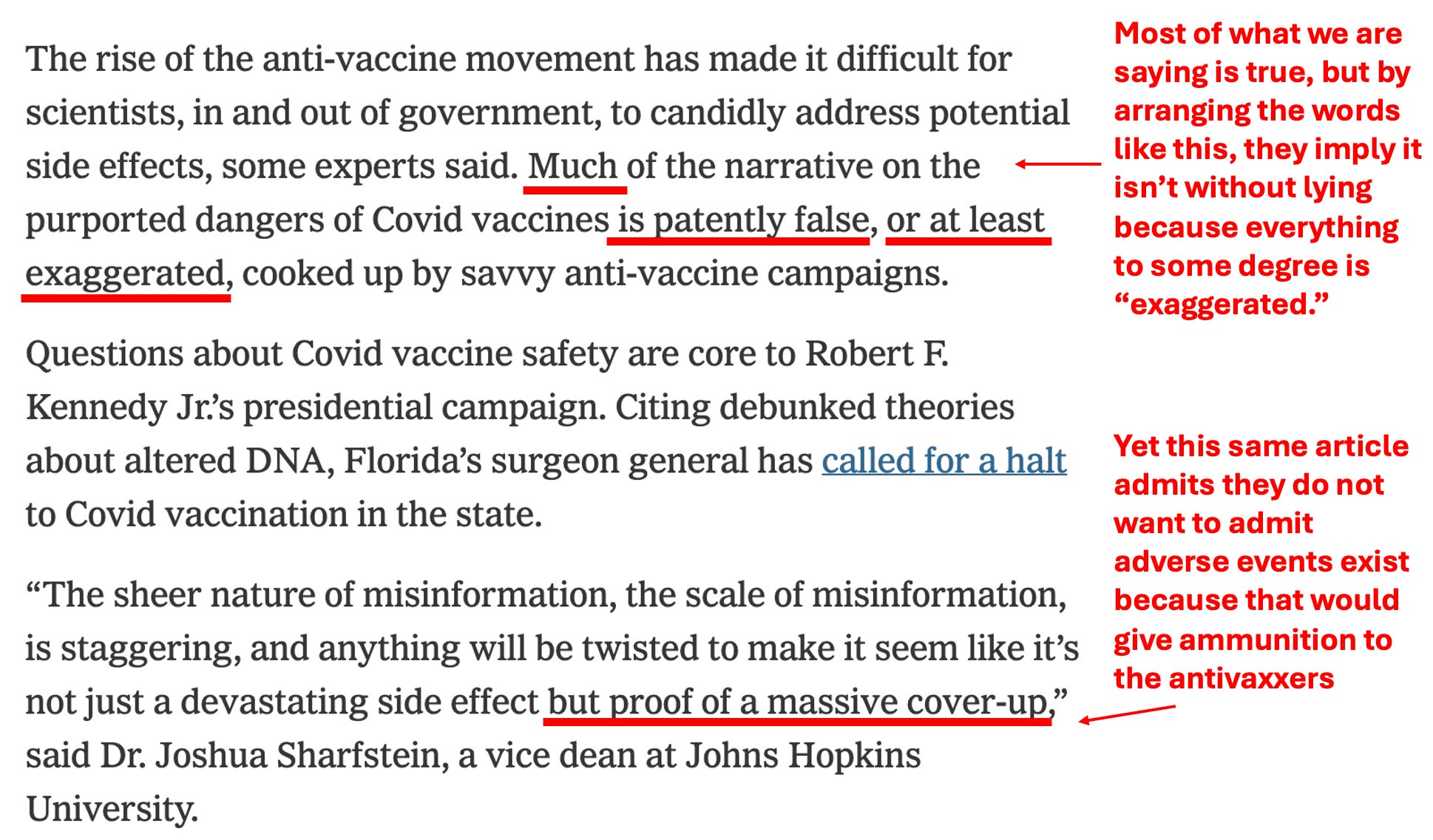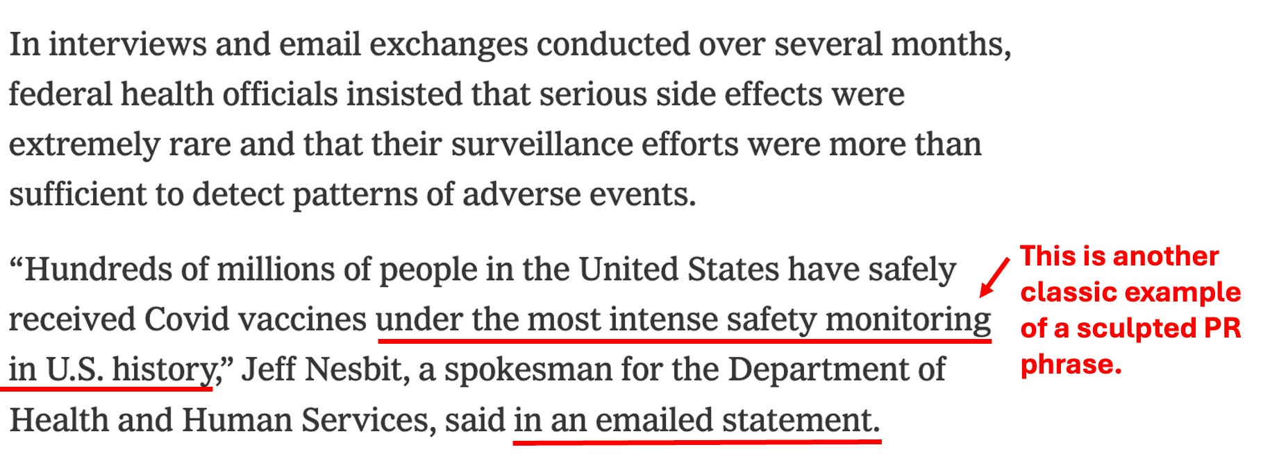 Here, the NYT tries to justify their complete failure here under the logic that the “most intense safety monitoring in US history” somehow could not detect injuries that were so obvious and apparent much of the general public was able to. Furthermore, all of these excuses are complete hogwash. For example: