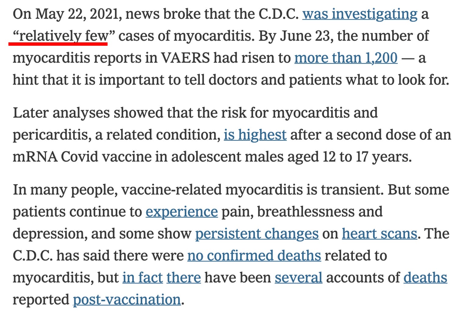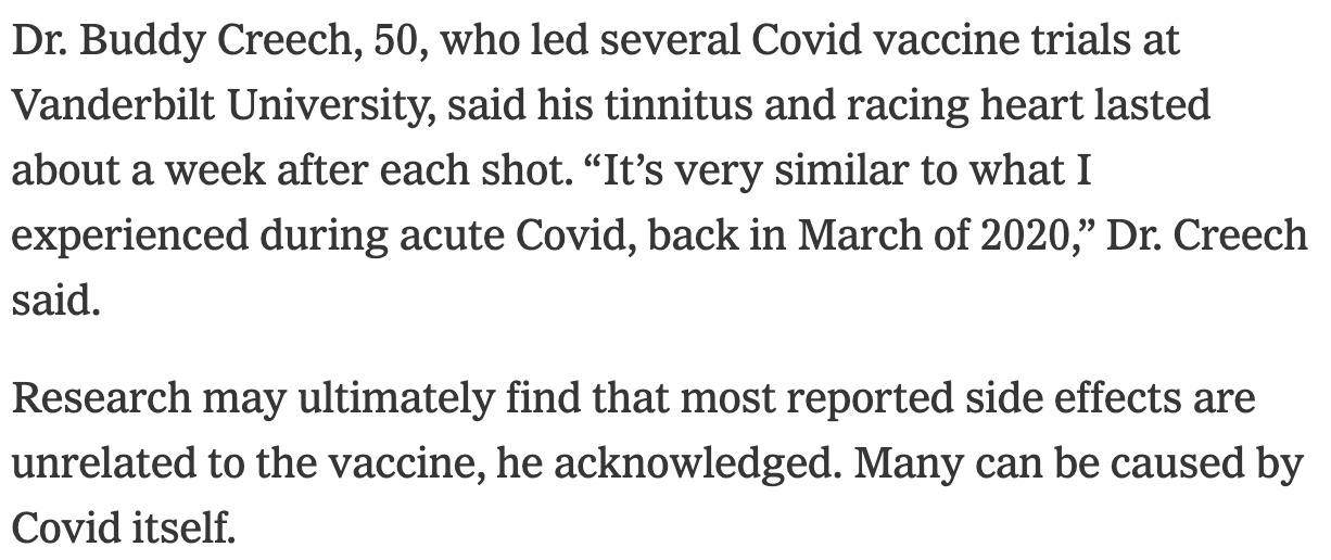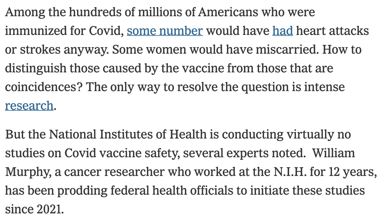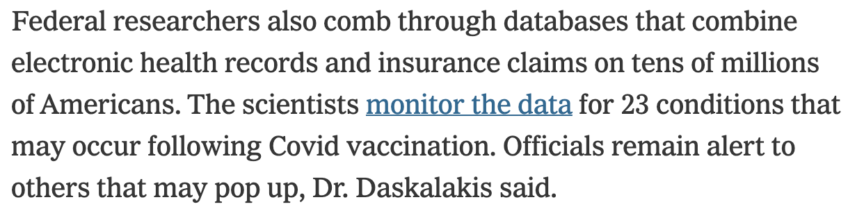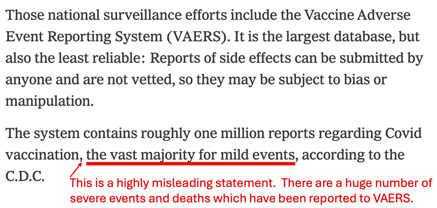 Here, the NYT tries to justify their complete failure here under the logic that the “most intense safety monitoring in US history” somehow could not detect injuries that were so obvious and apparent much of the general public was able to. Furthermore, all of these excuses are complete hogwash. For example: