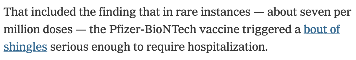 This is a misleading statement because almost all cases of shingles do not require hospitalization and the ones that do are really bad (e.g., that’s what killed Senator Dianne Feinstein). More importantly, it omits mentioning that if the rare cases are increased, there is a much larger increase in the common but extremely unpleasant cases (e.g., typical shingles).