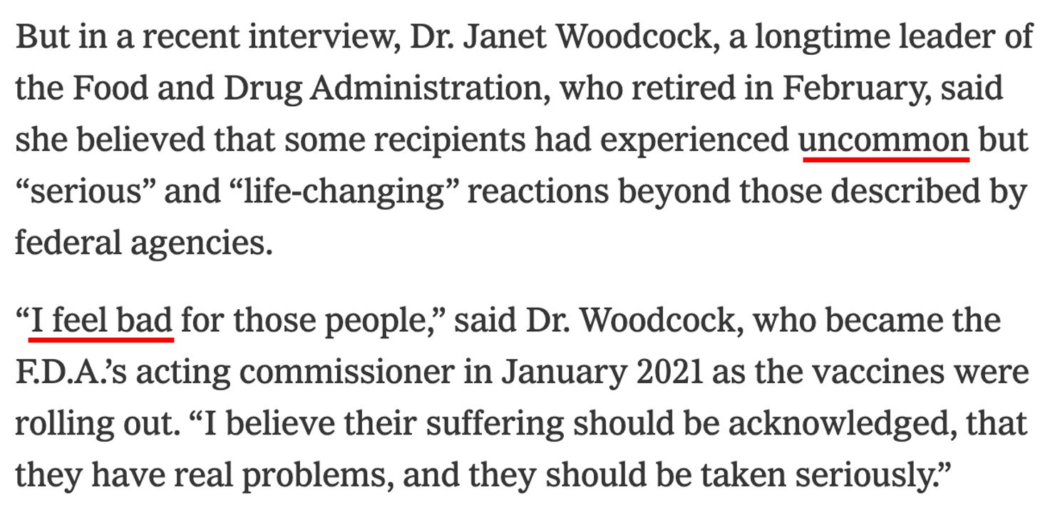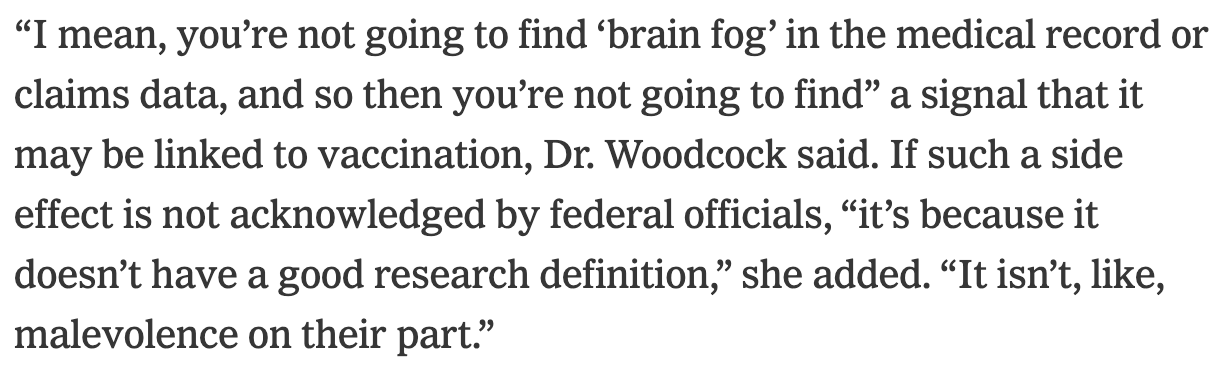 The context this passage omits to mention was that the initial wave of vaccine injured (e.g., those injured in the 2020 clinical trials) repeatedly requested for Woodcock to look into their injuries, and while Woodcock initially told them she cared and the FDA needed to investigate their data, once the injuries started piling up and the government realized this was not a rare problem they could manage, they switched to ghosting those injured by the vaccines.