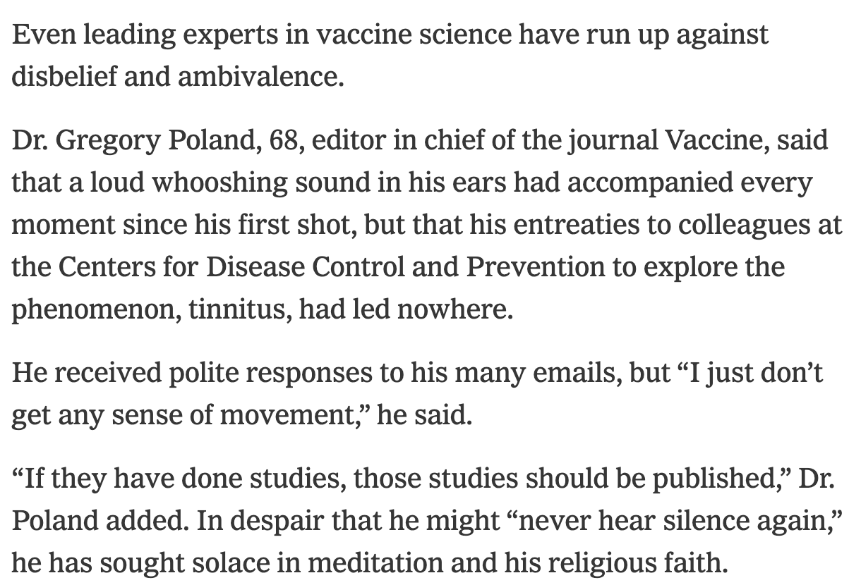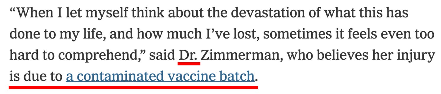For example, after opening on the tragic story of a neuroscientist who like many other Americans was disabled by the vaccine, the NYT produces evidence that suggests (but does not state) the problem was due to production issues rather than the vaccine itself.
