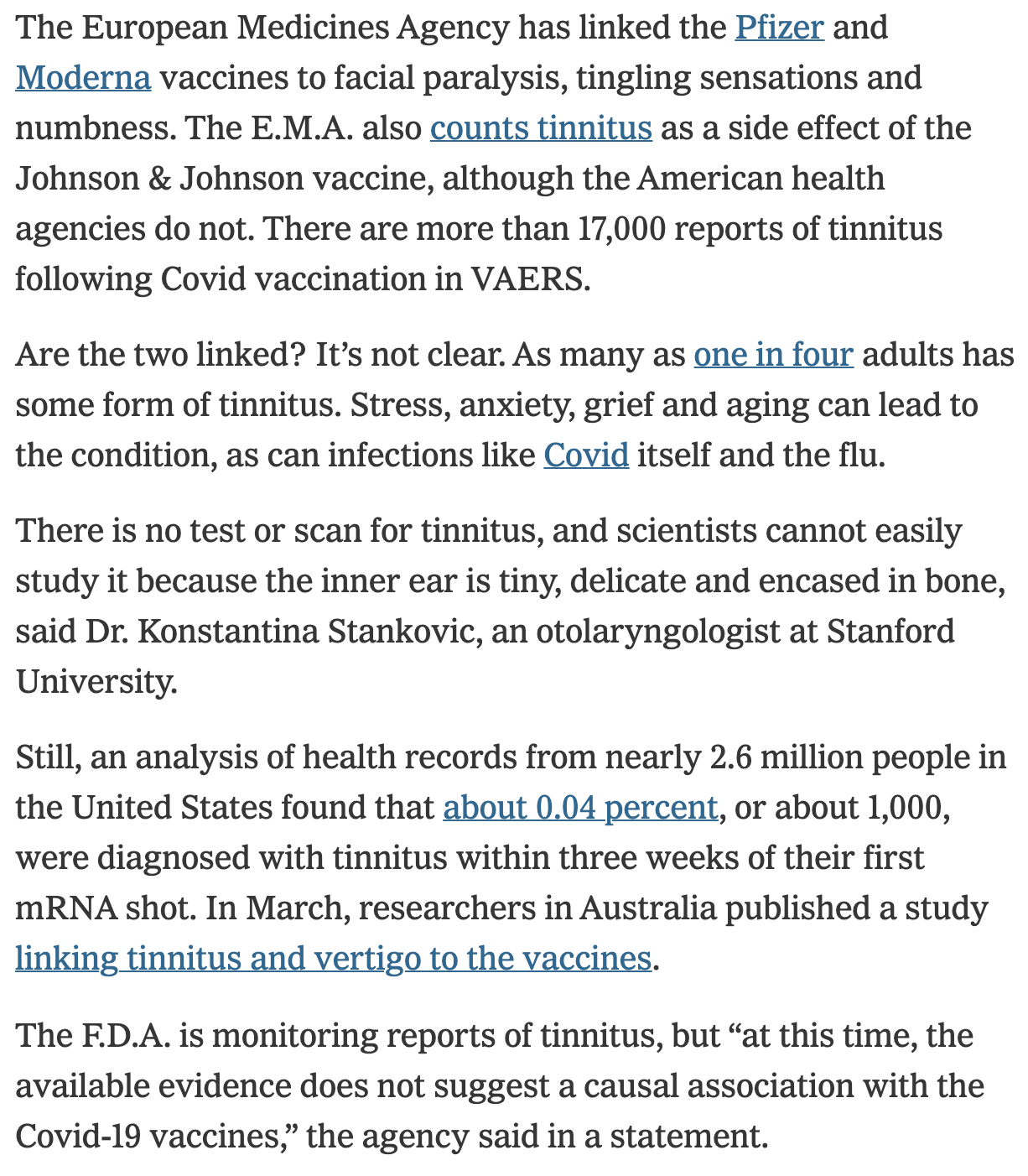 This section strikes an interesting balance between acknowledging and denying tinnitus (one of the most commonly reported side effects of the vaccine). In addition to some missing data, the key point it neglects to mention is that all tinnitus is not the same (e.g., many cases are quite minor) whereas the COVID vaccine also produces severe side forms of it.