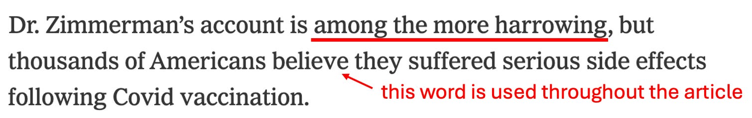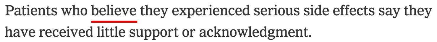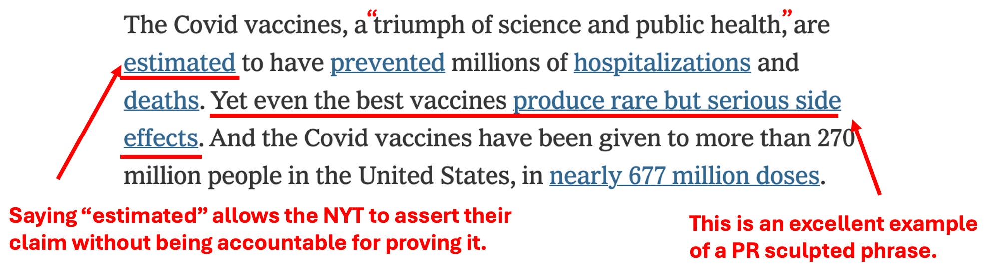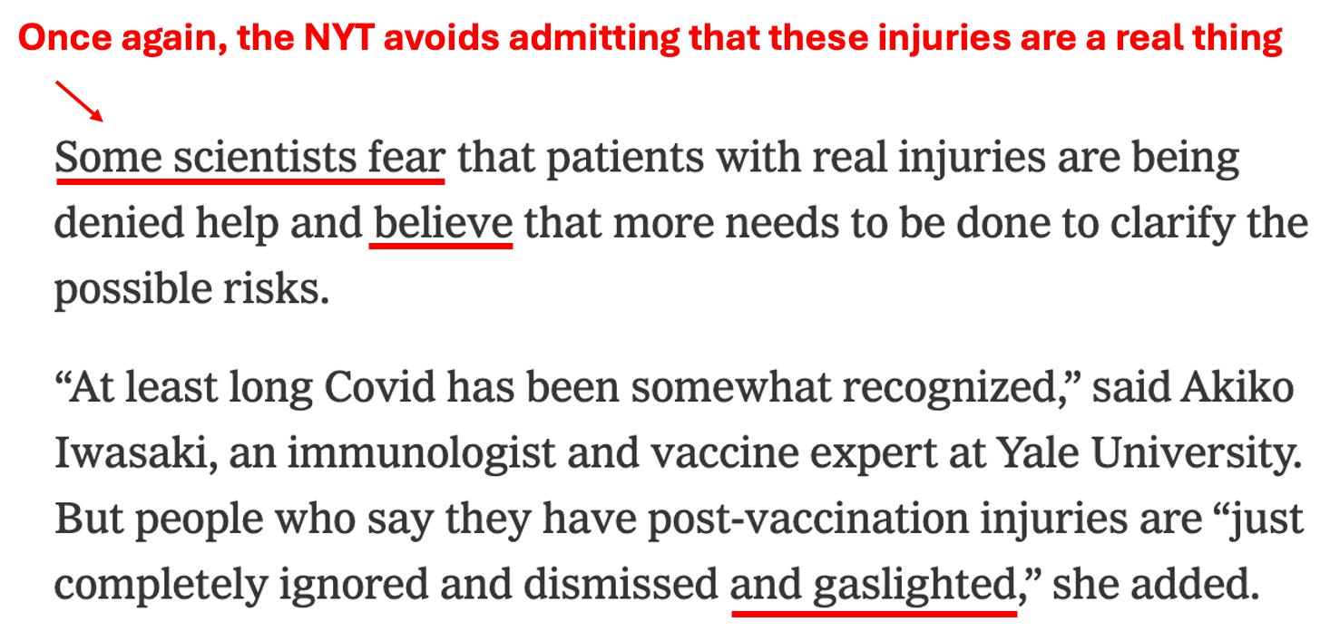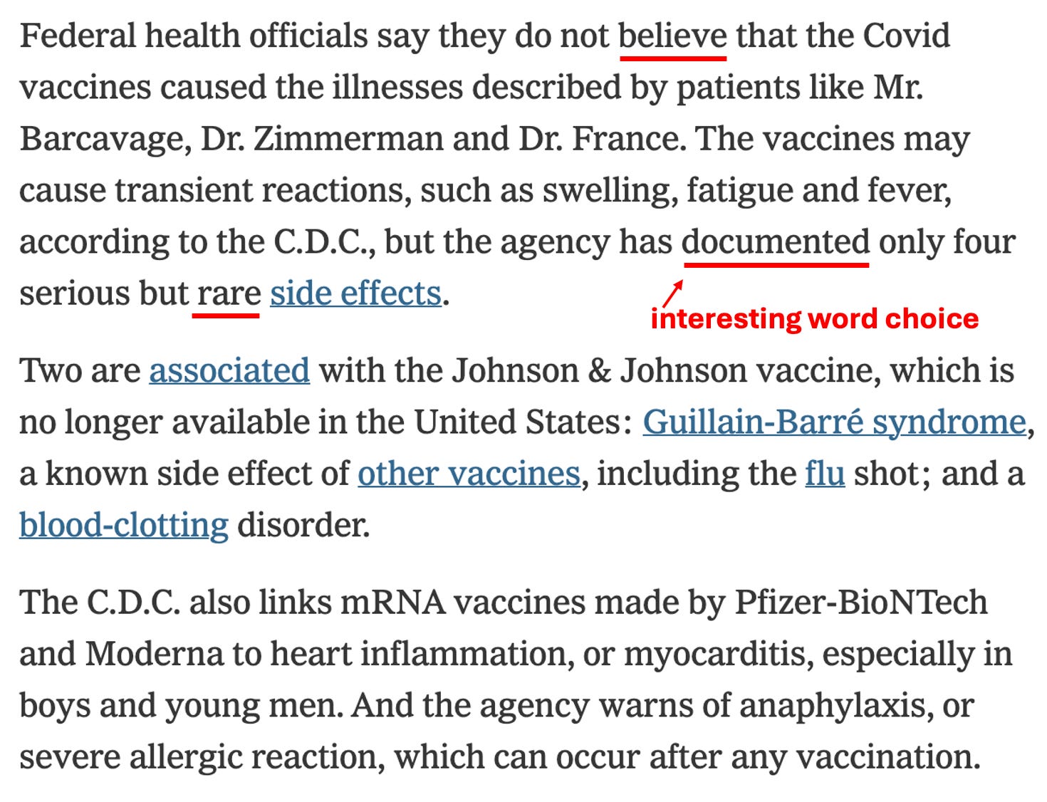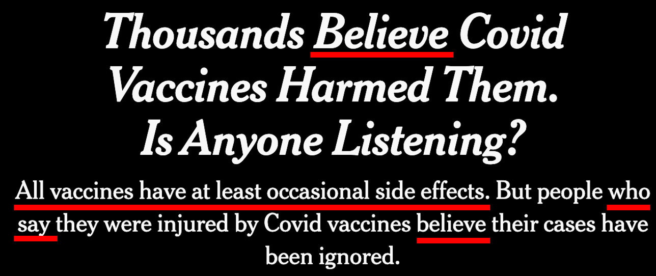 In turn, I would argue the NYT was not using “believe” in the way I believe is appropriate to do and instead doing the latter two. Thus, like all good propagandists, they are attempting to find a way to twist the situation so that they can have their cake and eat it. Similarly, if you consider the other underlined phrase, it’s clear someone spent a lot of time trying to figure out how to write something that sounded like an acceptable admission and apology to those injured by the vaccines but simultaneously suggested that those injuries aren’t really a thing and there is nothing to be concerned about with the vaccine.
