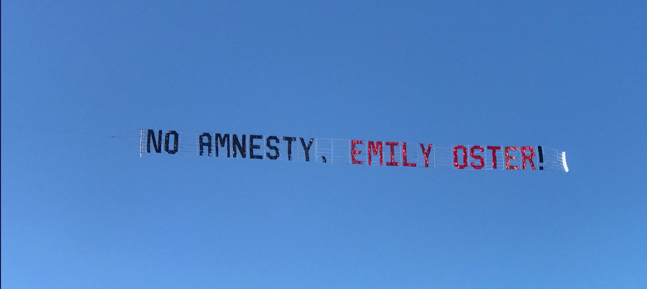 For a variety of reasons, this response rubbed a lot of people the wrong way (e.g., contrary to Oster’s claims, at the time there was an abundance of data showing the COVID policies were wrong) and it prompted an uproar online which eventually prompted one person (I cannot disclose the name of) to have this flown over Oster’s house:
