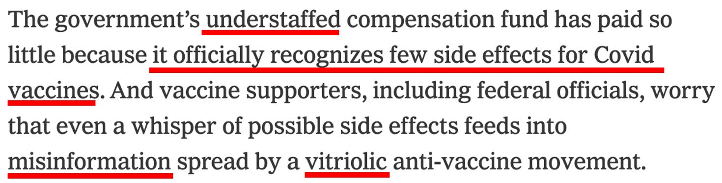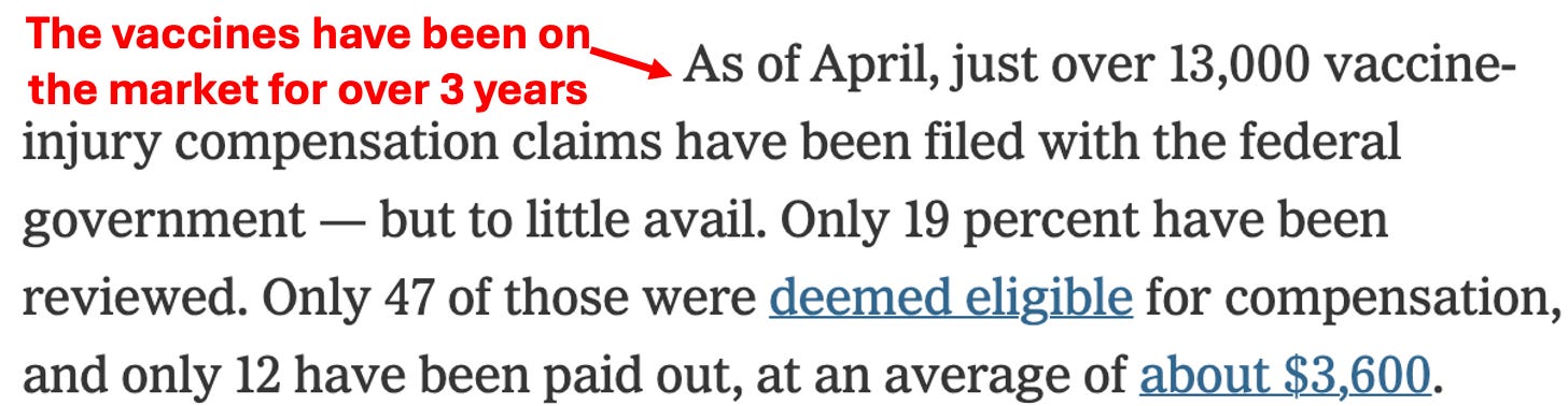 Note: the rest of the NYT article discusses the challenges individuals injured by the COVID vaccines face being compensated by the government’s program and attributes this to the COVID vaccines not having a tax on them like the normal vaccines to fund a compensation program. This is somewhat deceptive as it implies the normal compensation program works for individuals with vaccine injuries (it typically doesn’t) and that the primary issue is a lack of funding for the compensation program (whereas the actual issue is the legal immunity that makes it impossible to sue the vaccine manufacturers regardless of how egregious their conduct is).