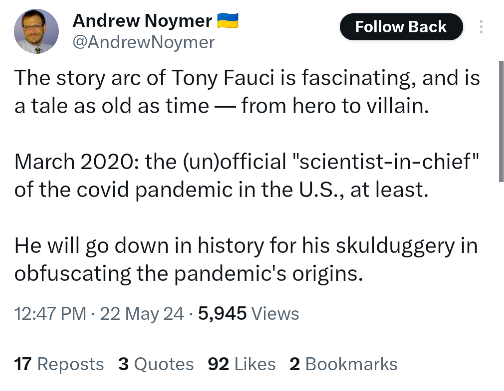 He states the reason Fauci and Francis Collins did this was to protect their reputation from association with Peter Daszak and Eco health alliances NIH funded Wuhan research on gain of function
