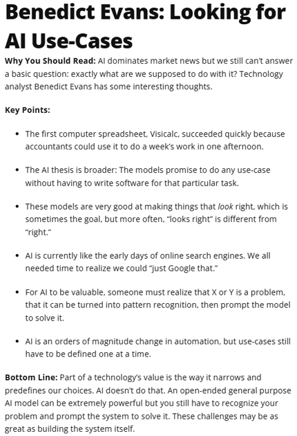 But to put this in context, let’s review a piece my associate Patrick Watson recently shared with subscribers of our Over My Shoulder service, in which we send succinct summaries of interesting research. Here’s how Patrick described a pithy essay on AI by technology analyst Benedict Evans: