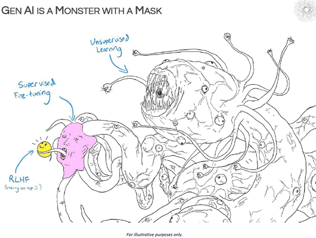 “The way it’s understandable to us, though, is that there’s a kind of quasi-humanish mask that’s put on top of it. That’s the fine-tuning that’s put on top of the unsupervised learning that’s all happening and is the alienness of generative AI.