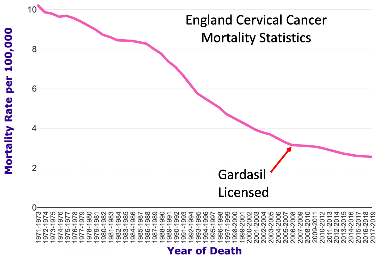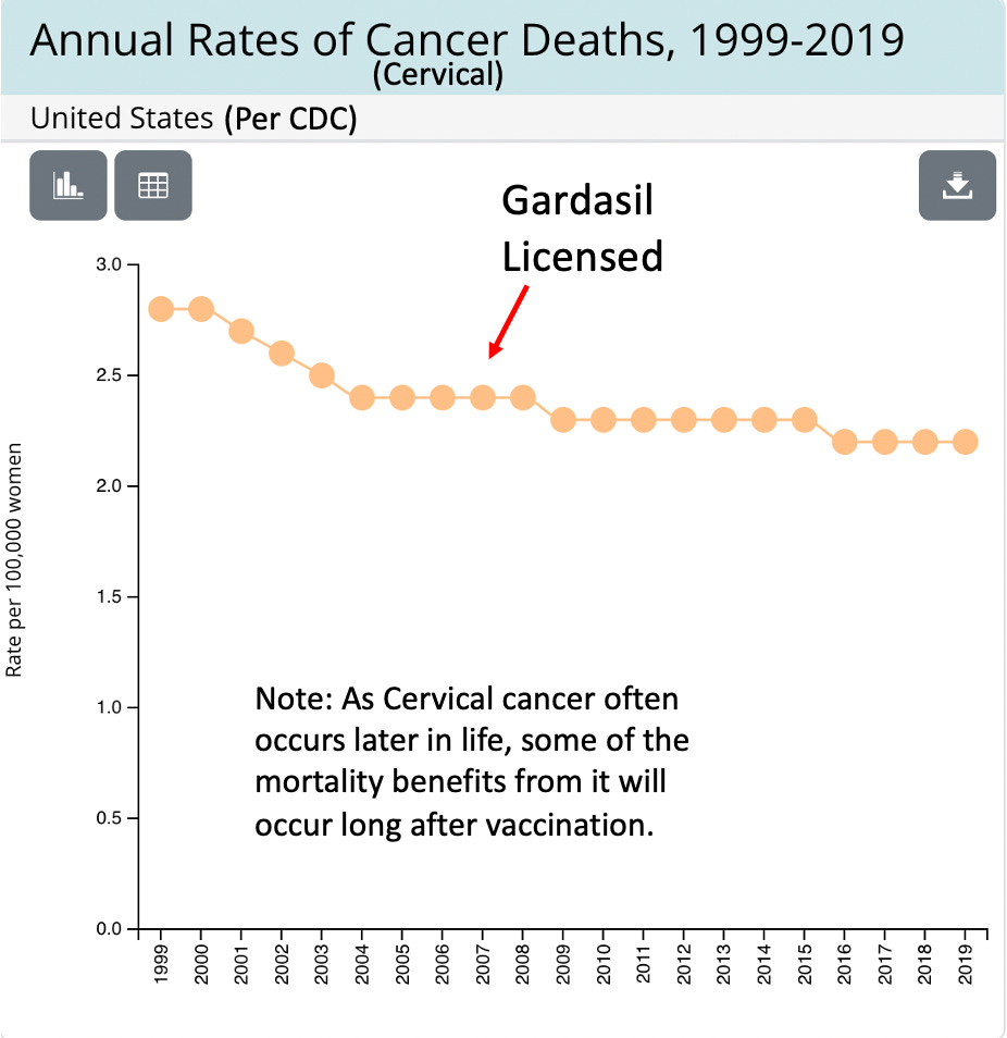While I have seen datasets (when stratified by age) showing Gardasil (and other HPV vaccines) actually increased the cervical cancer death rate in those vaccinated, I will give it the benefit of the doubt here. As the graph shows, cervical cancer rates were already approaching 0 before Gardasil, so it is difficult to say if any of the lives saved were due to it (at this point I believe the cancer prevention attributed to Gardasil is false).