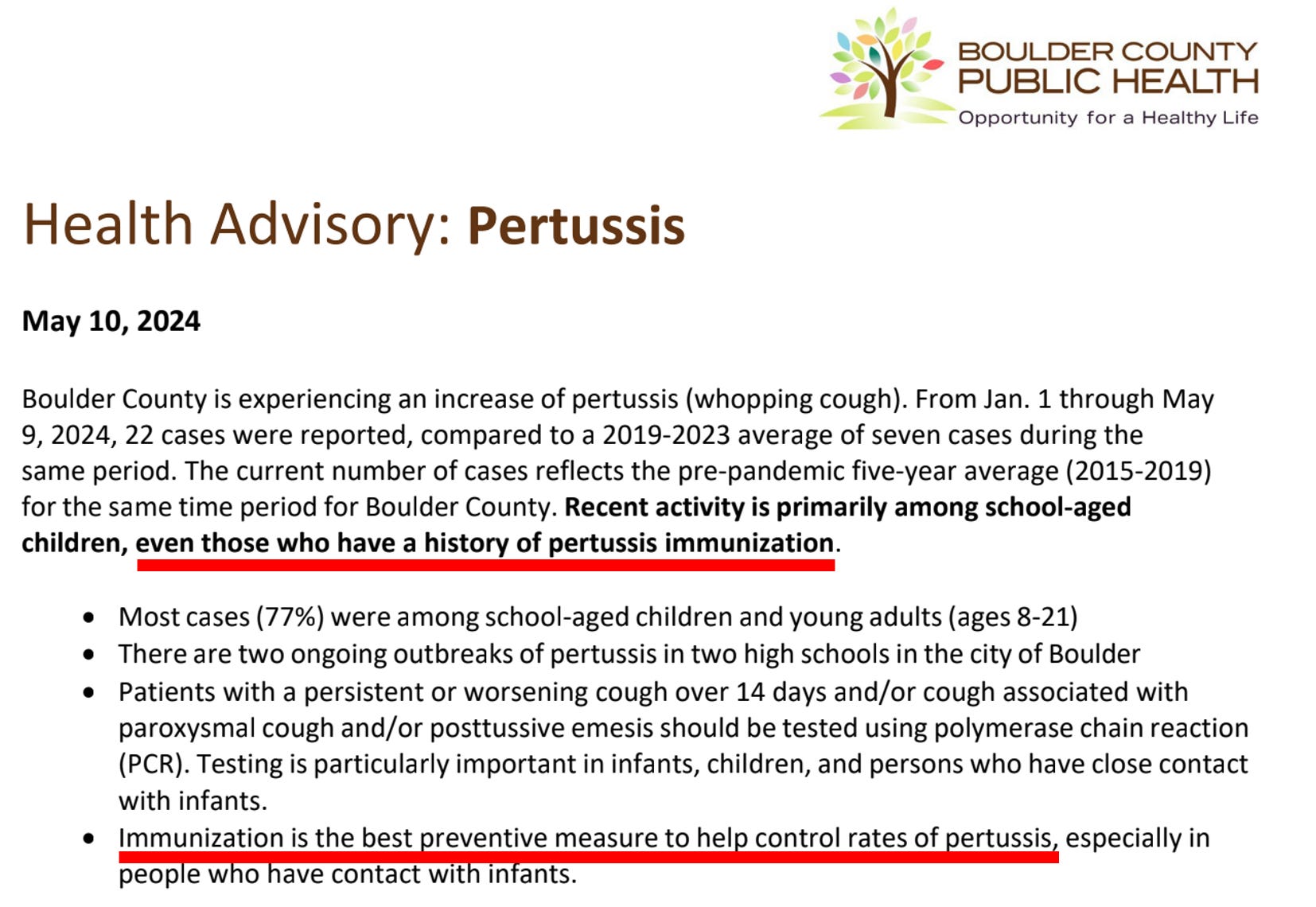 Note: for those interested in this subject, I discussed how vaccines consistently fail to prevent disease transmission here, and how we watched this unfold with the COVID-19 vaccines here. One of the things I find particularly unfair about this failure is that a common marketing tactic used to sell vaccines (particularly for pertussis and COVID-19) is by convincing everyone it’s not safe to be around an unvaccinated individual and hence create the peer pressure to vaccinate (e.g., grandparents periodically tell me they can’t see their grandchild because they refused to get a pertussis vaccine). Beyond the fact this is nonsensical (e.g., if the vaccine works it shouldn’t matter if other people are unvaccinated) as the above example (and what we saw throughout COVID-19) showed, it’s also patently false.