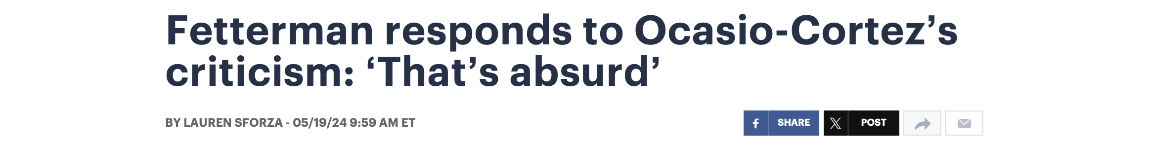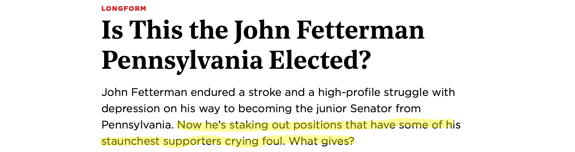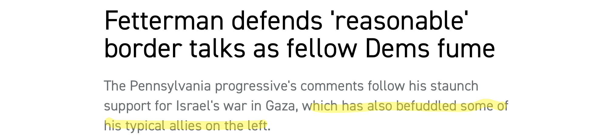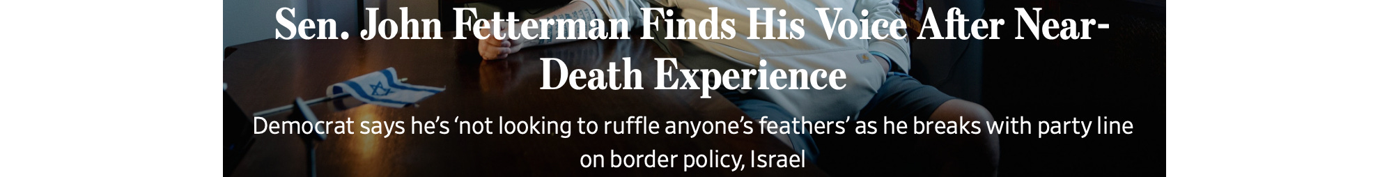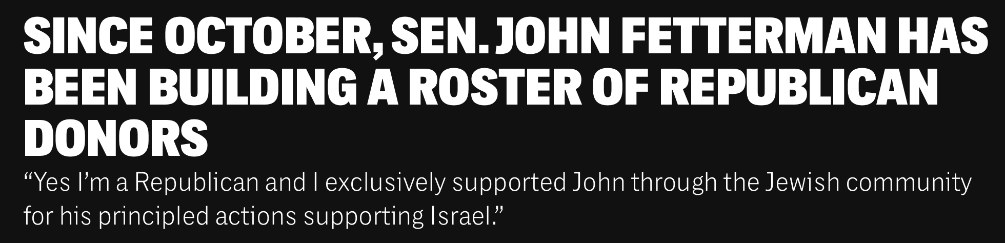Fetterman has been rocking the political boat and causing rogue waves recently, such as by clashing with AOC, calling for border reform, supporting Israel, and attacking democrat bribe magnate Bob Menendez. Democrats aren’t supposed to think for themselves, after all, and Senator Fetterman least of all. But recent corporate media headlines about Senator Fetterman express bemusement, if not downright disgust, at the disabled Senator’s rightward migration. A few examples follow. From the Wall Street Journal, two days ago: