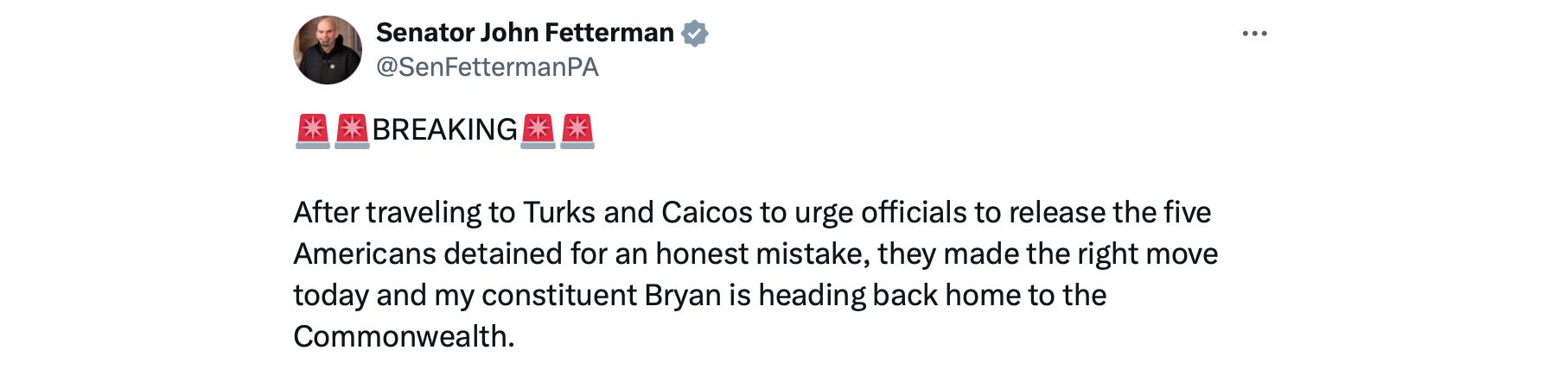 Vaccine injury survivor and Senator John Fetterman led the bipartisan effort to rescue our imprisoned citizens, including Bryan, who is one of Fetterman’s constituents. Fetterman flew to the Turks & Caicos with several other lawmakers last week, and secured the hapless citizens’ release with only a fine of $6,700, which Bryan was surely happy to pay.