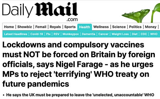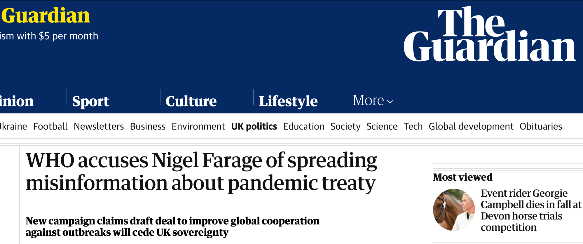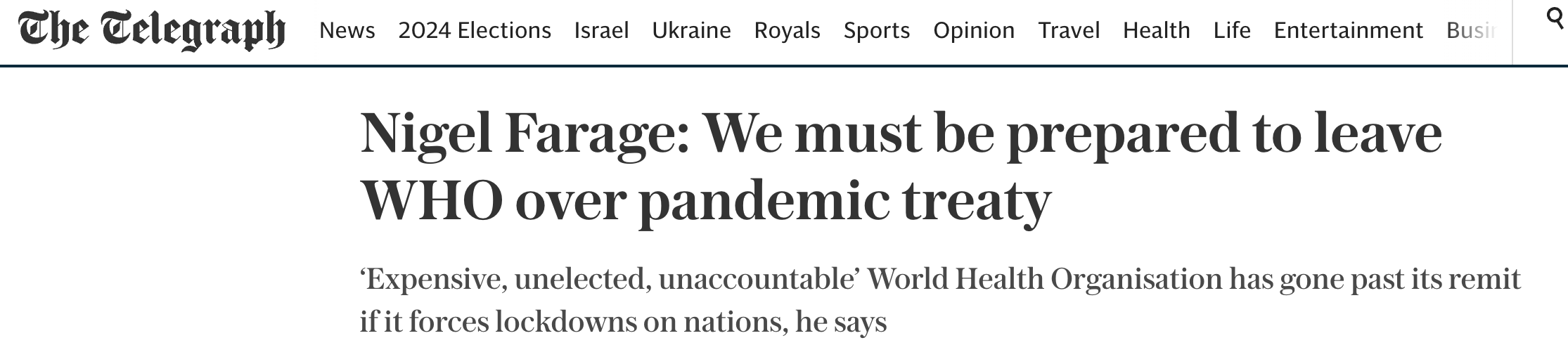 First British conservative/libertarian politician, thought leader and broadcaster Nigel Farage drew major corporatist UK mainstream media fire for opposing the WHO pandemic “accord” (the not really a “treaty”- treaty).