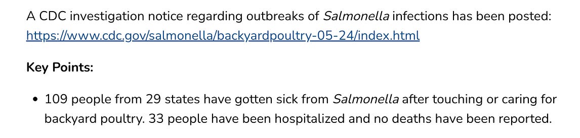 One out of 230 salmonella cases, yet the CDC is completely focused on the risk of salmonella associated with backyard poultry in its public messaging and warnings.